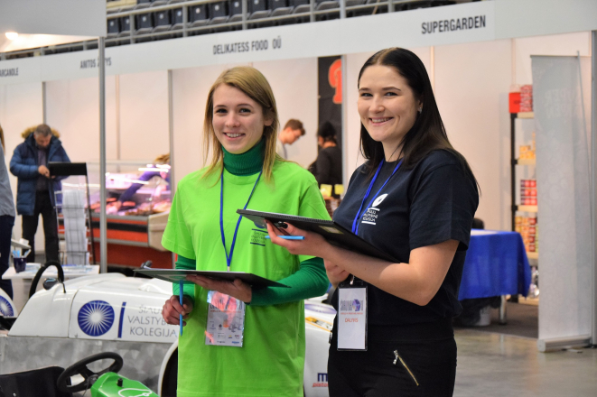Šiaulių valstybinės kolegijos atstovus buvo galima sutikti ne tik prie kolegijos stendo – į parodą aktyviai įsitraukė Verslo ir apskaitos katedros studentai: tapę renginio savanoriais, jie padėjo organizatoriams atlikti lankytojų apklausą.