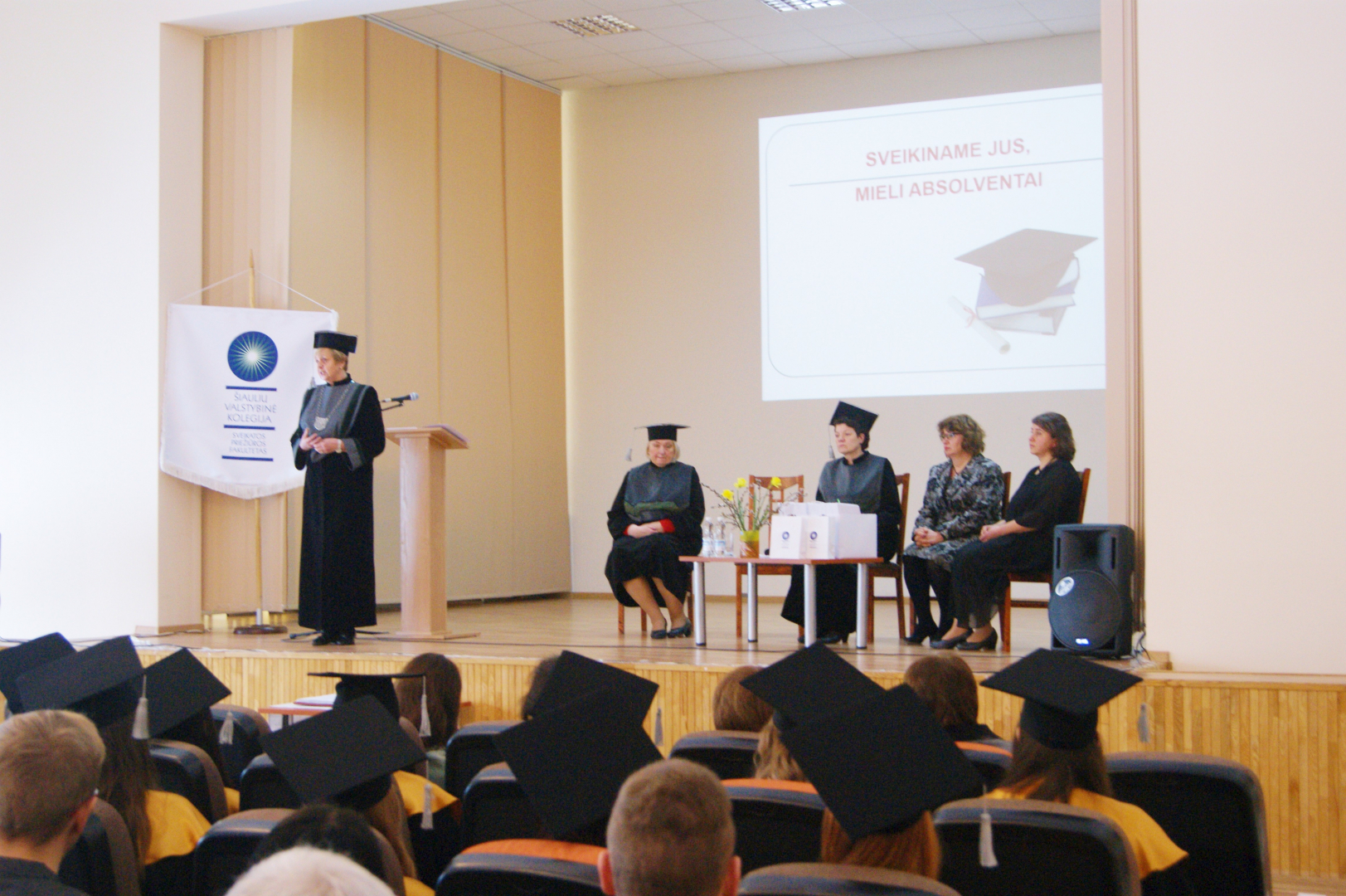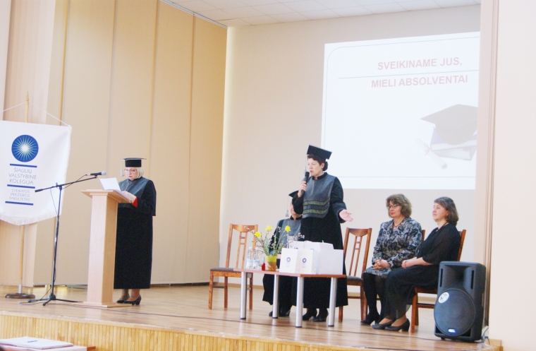 Iškilmingoje diplomų įteikimo ceremonijoje kalbėjusi aukštosios mokyklos direktorė dr. Natalija Šedžiuvienė pasveikino absolventus, įveikusius 3,5 metų trukusias studijas, palinkėjo jiems sėkmės profesinėje veikloje ir asmeniniame gyvenime, padėkojo vakarykščių studentų šeimoms ir artimiesiems už pagalbą ir palaikymą per visą studijų laikotarpį. Kaip pabrėžė direktorė, absolventai nuo šios dienos tampa Šiaulių valstybinės kolegijos ambasadoriais.